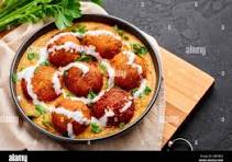 A traditional curry hailing from the north of India; malai koftas are vegetarian koftas or croquettes made with spiced potato and paneer (Indian cottage cheese) steeped in a tomato curry. |